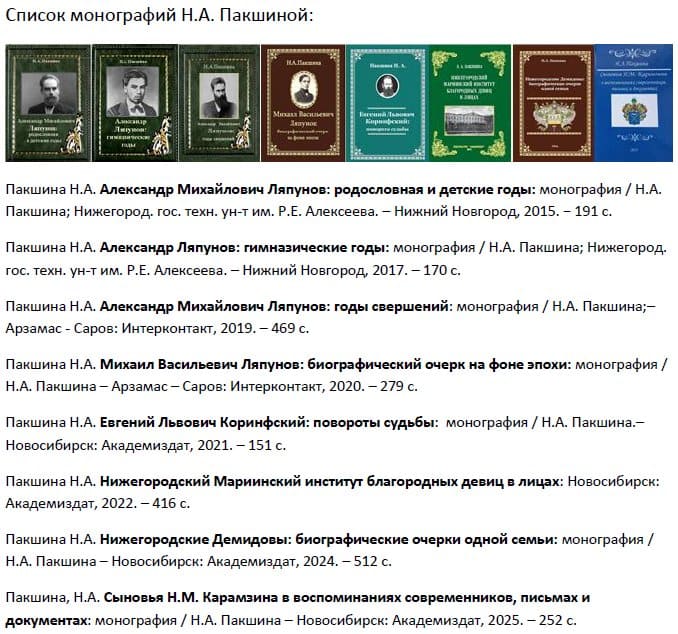 Наталья Алексеева Пакшина – кандидат технических наук, доцент кафедры «Прикладная математика» АПИ НГТУ им. Р.Е. Алексеева, профессор РАЕН, Почетный работник высшего профессионального образования России, имеет Почетное звание «Заслуженный деятель науки и техники», член Союза Возрождения Родословных Традиций, действительный член общества «Нижегородский краевед». Параллельно с публикацией научных статей и учебных пособий по техническим дисциплинам она более 20 лет увлеченно и упорно работает над историко-биографическими исследованиями. Их результаты и были представлены в виде восьми монографий, изданных в течение 2015-2025 гг. Первые три монографии посвящены создателю фундаментальной теории устойчивости механических систем в статике и динамике – русскому ученому с мировым именем Александру Михайловичу Ляпунову. Тщательные поиски в архивах Арзамаса, Нижнего Новгорода, Казани, Санкт-Петербурга и др., многочисленные встречи и переписка с потомками знаменитых фамилий дали богатый материал по связям рода Ляпуновых с другими известными в России семьями и географии их проживания. Поэтому закономерно, что появились и другие монографии: о Е.Л. Коринфском, о нижегородской ветви Демидовых, о сыновьях Н.М. Карамзина и т.д.
